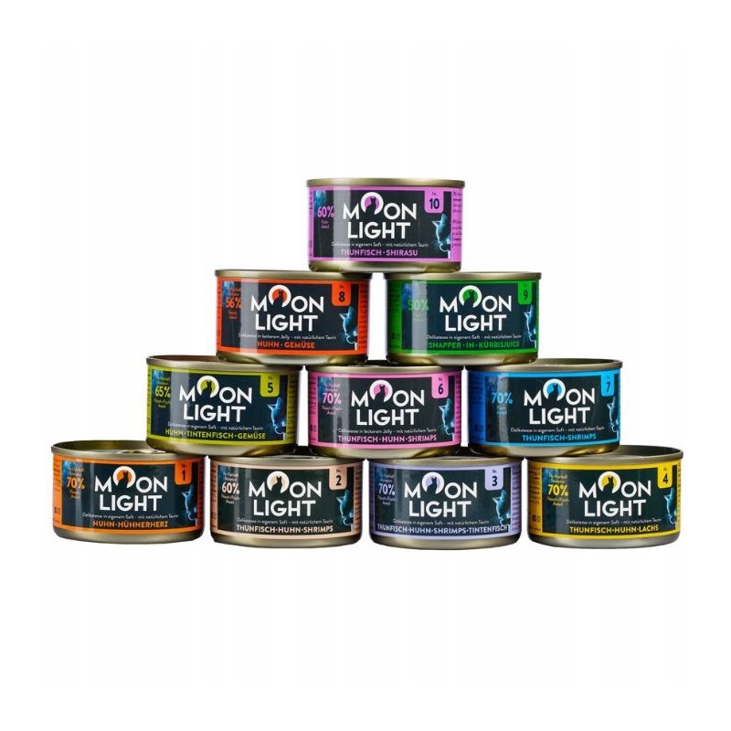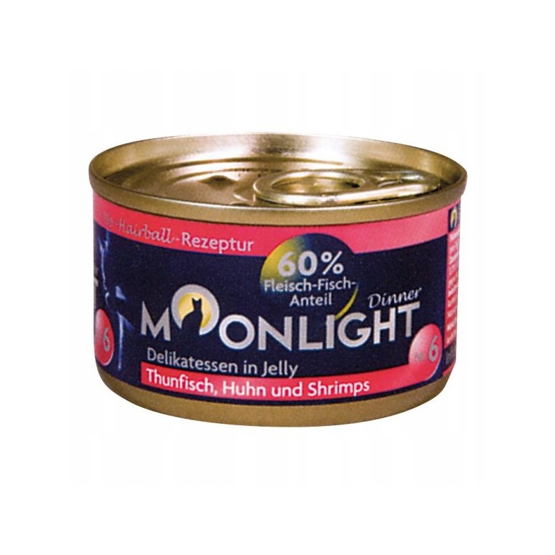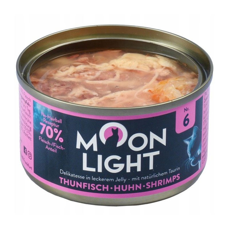 Karma Moonlight 6 w smaku tuńczyk+kurczak+krewetka to dobry wybór dla opiekunów szukających sposobu na urozmaicenie menu swojego kota smacznym, mokrym posiłkiem. Nadaje się jako podstawowa dieta lub jako przysmak uzupełniający karmę suchą. Pojedyncze opakowanie pozwala na łatwe serwowanie i zachowanie świeżości.