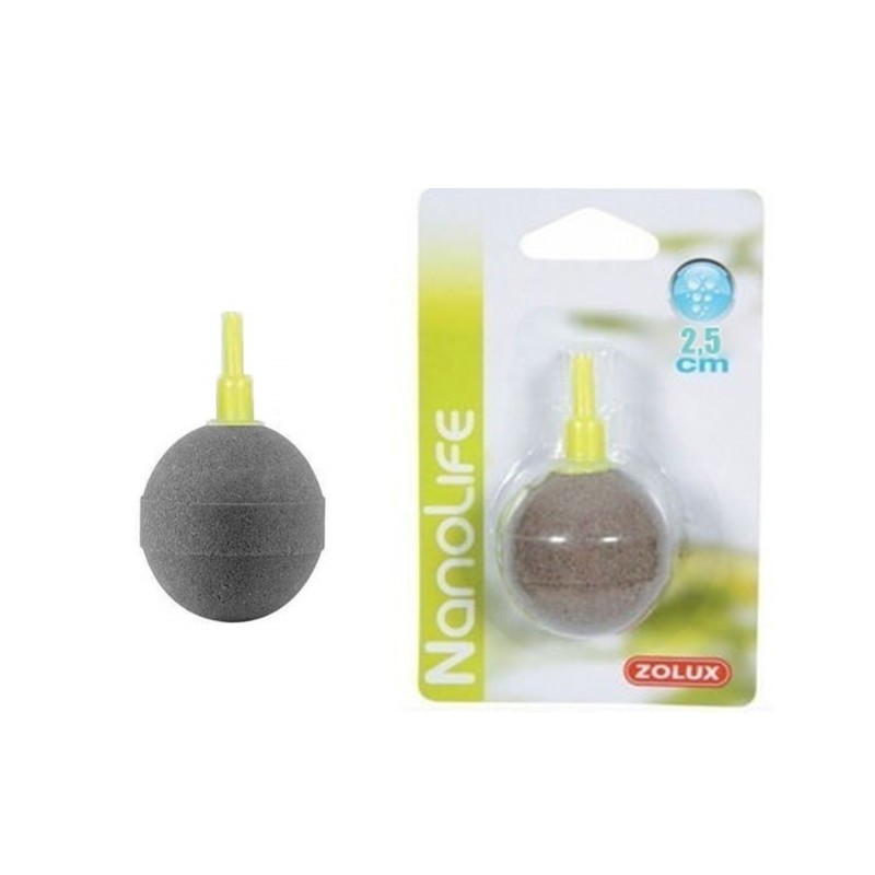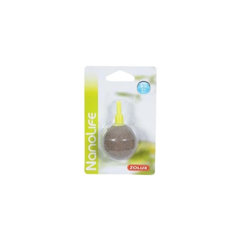 Kamień wykonany jest z drobnoziarnistego, syntetycznego materiału, który gwarantuje równomierne i obfite wydzielanie bardzo drobnych pęcherzyków. Taka drobnobańkowa kurtyna nie tylko skutecznie natlenia wodę, ale także tworzy dekoracyjny efekt wizualny, szczególnie widoczny przy odpowiednim oświetleniu. Jego kompaktowy, kulisty kształt o średnicy 2 cm ułatwia dyskretne umieszczenie wśród dekoracji lub roślin.