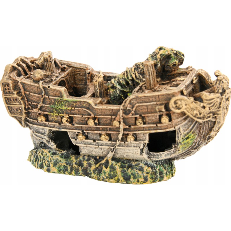 Realistycznie odwzorowane detale, takie jak poszarpany kadłub, pozostałości masztów i faktura imitująca zardzewiały metal, tworzą autentyczny wygląd statku, który spoczywa na dnie od dawna. Ta patyna nie tylko wygląda przekonująco, ale także zapewnia doskonałą kryjówkę dla mniejszych ryb, skorupiaków czy krewetek, zwiększając ich poczucie bezpieczeństwa w akwarium.