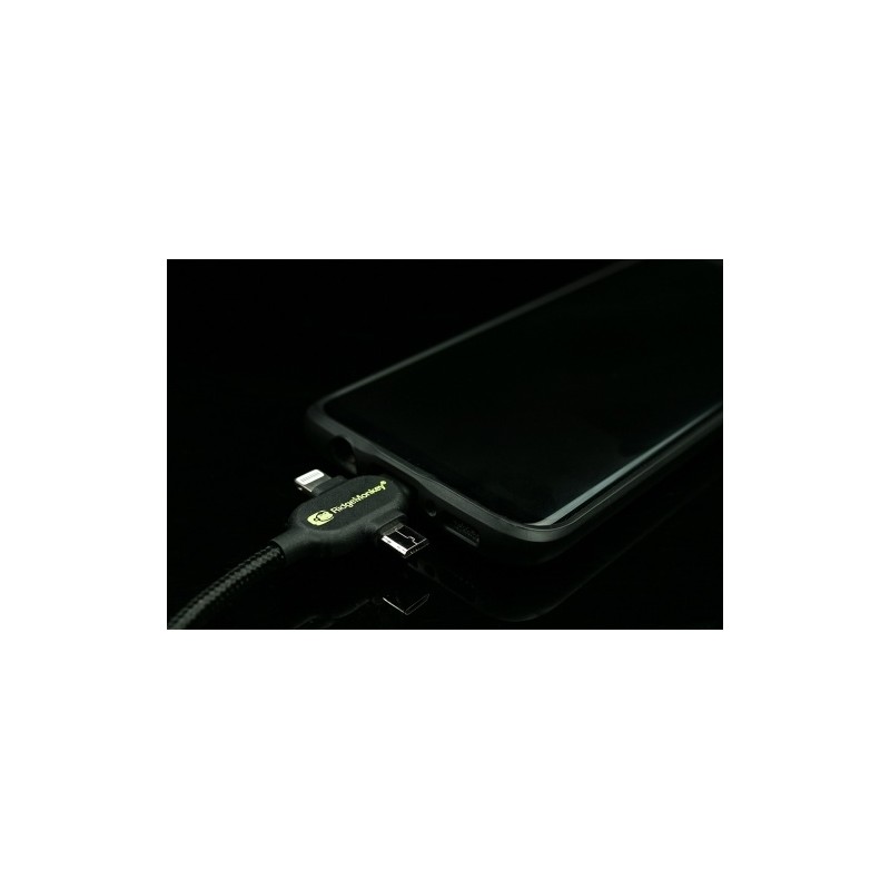 Kabel do ładowania RidgeMonkey. Jest kompatybilny z prawie wszystkimi nowoczesnymi urządzeniami. Jego największą zaletą jest to, że wszystkie 3 końcówki można używać jednocześnie.