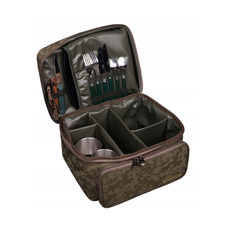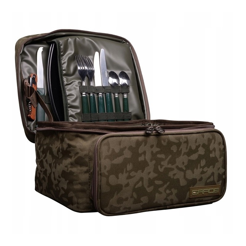 Torba na akcesoria kuchenne w zestawie z kompletem potrzebnych nad wodą sztućców, talerzy czy kubeczków. Komora główna wykończona jest w wodoodpornym, łatwym w utrzymaniu czystości PCV i pomieści zestaw garnków, kuchenkę gazową czy czajnik. Torba wykończona w kolorystyce subtelnego kamuflażu Grade.