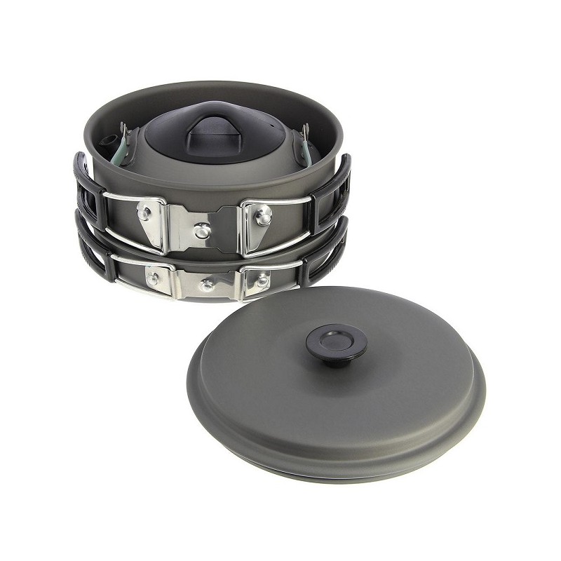Zestaw naczyń turystycznych wykonany z wytrzymałego aluminium.