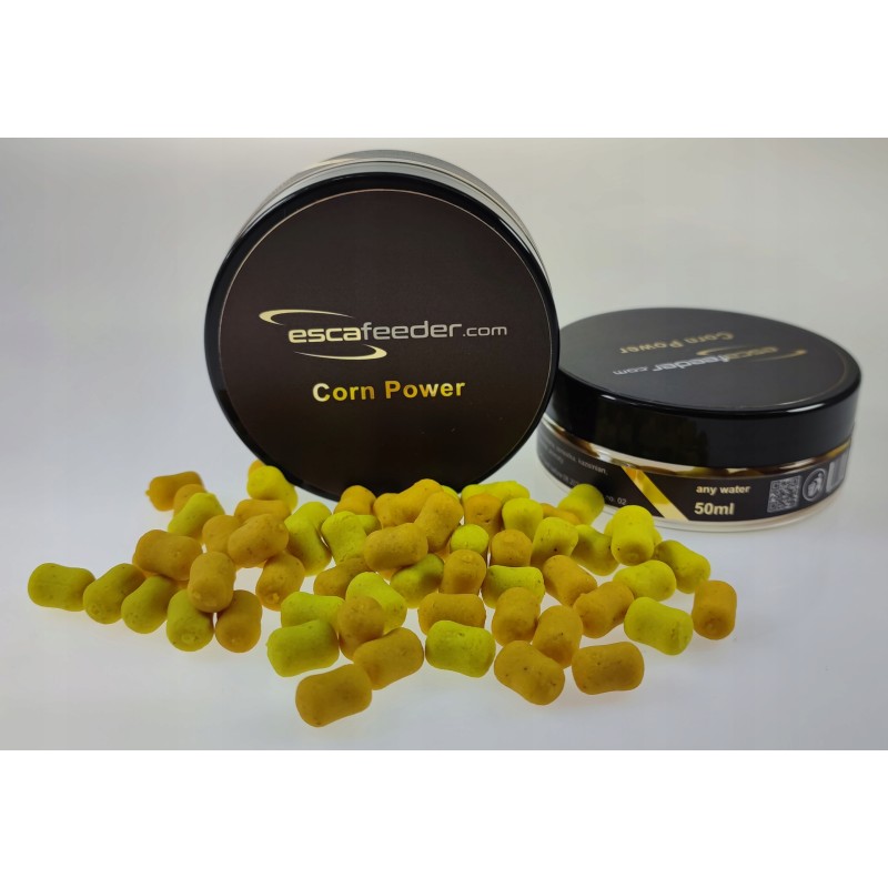 Kukurydziane waftersy opracowane pod kątem łowienia bombką, kiedy główną zanęte stanowi kukurydza wystrzeliwana za pomocą procy. Waftersy swoją zbalansowaną pracą pozwalają wyróżnić przynęte spośród kilkuset ziaren stabilnie spoczywających na dnie. Dzięki temu jest szybciej zauważalna dla żerujących ryb. W pojemniku znajdziemy przynęty o dwóch odcieniach żółci – jaskrawym i stonowanym – to dodatkowy sposób na wyróżnienie naszej przynęty od zanęty. Aromat użyty przy produkcji Corn Power wiernie przypomina konserwową kukurydzę, co dodatkowo potęguje ich skuteczność.