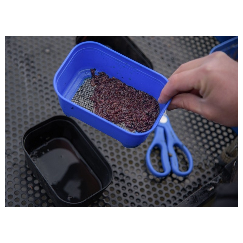 Cresta Baitstrainer to doskonałe narzędzie do optymalnego przygotowania przynęt, takich jak robaki, czerwie i pellety. Spód jest wykonany z metalu o drobnej siatce, który jest całkowicie zatopiony w plastiku dookoła. Dzięki temu osuszanie drobno posiekanych robaków, przesiewanie lub płukanie robaków lub moczenie granulek jest bardzo łatwe i skuteczne! Dzięki kompaktowym rozmiarom i inteligentnej konstrukcji, Cresta Baitstrainer pasuje dokładnie do pudełek na robaki Cresta, dzięki czemu mogą pełnić funkcję tacki ociekowej. Ponadto pokrywa pojemnika na robaki pasuje również do filtra siatkowego.
