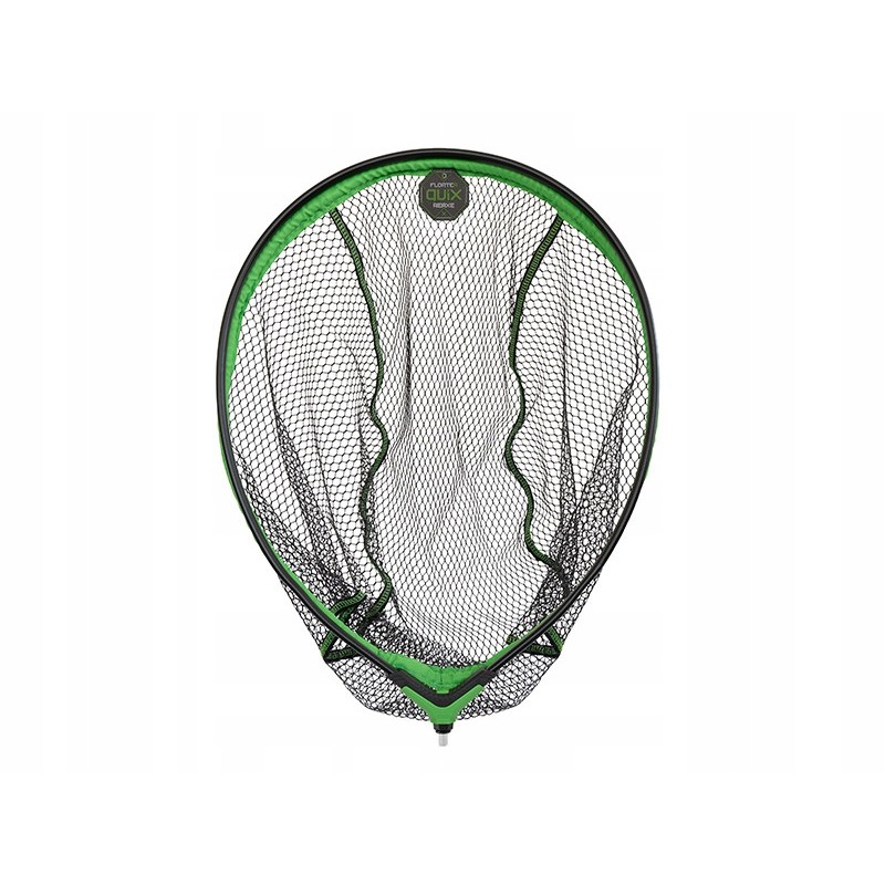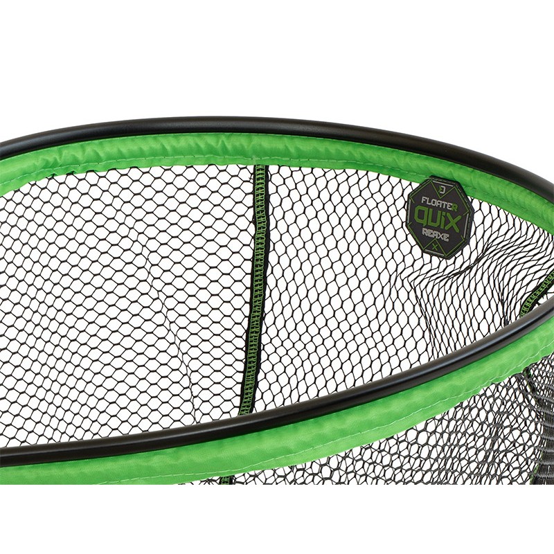 Pływający owalny kosz podbieraka z serii REAXE z lekką, ale wytrzymałą czarną aluminiową ramą. Siatka podbieraka FloateR QUIX pokryta jest gumą, dzięki czemu nie chłonie wody i szybko schnie. Dodatkowo jest pokryta zieloną tkaniną na całej ramie od spodu, aby zwiększyć trwałość.