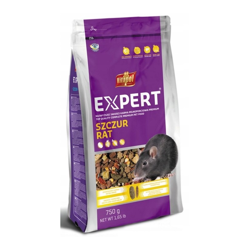 Karma Expert Szczur 750g VITAPOL to pełnoporcjowe, zbilansowane pożywienie, stworzone z myślą o codziennej diecie szczurów domowych. Jej skład został opracowany tak, aby dostarczyć gryzoniom wszystkich niezbędnych składników odżywczych, wspierając ich zdrowie, witalność i naturalne instynkty.