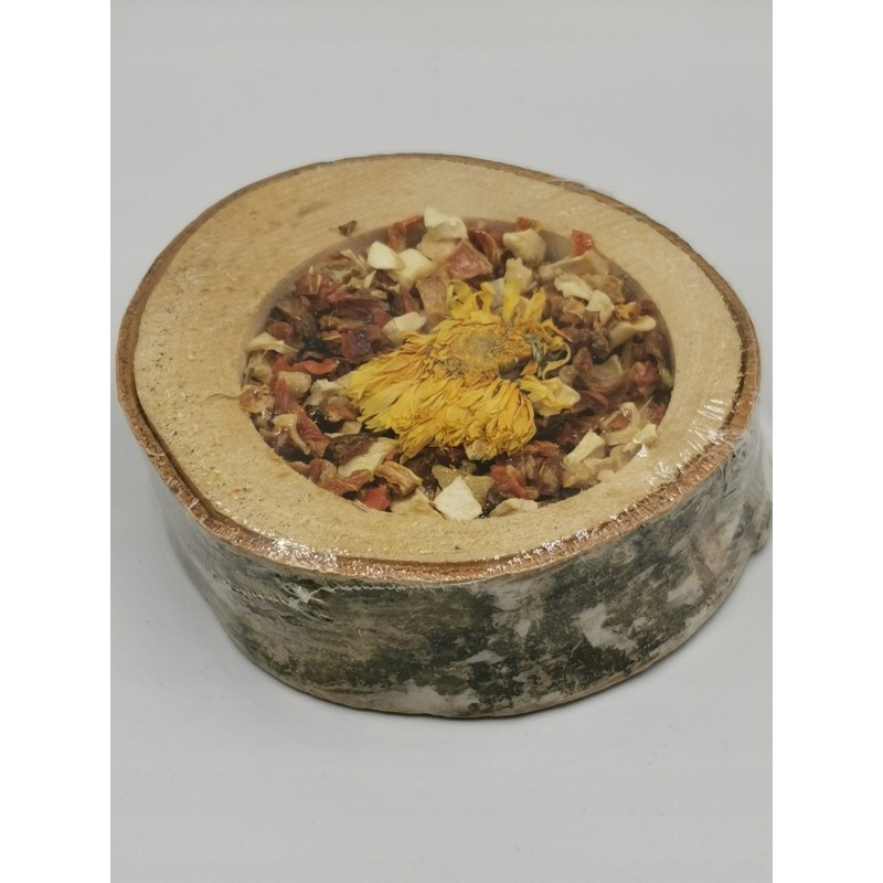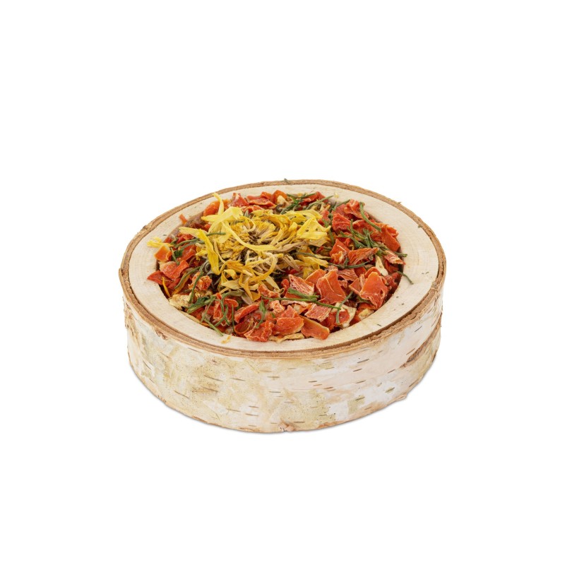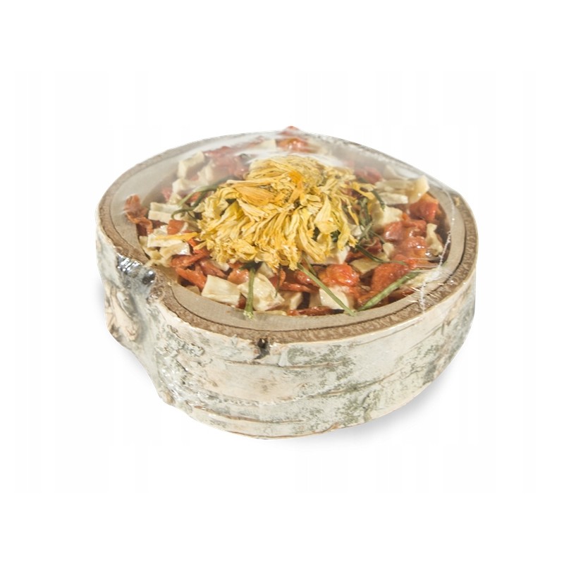 Miseczka ma formę sprasowanego krążka, który składa się z mieszanki suszonych warzyw. Dokładny skład zawsze warto sprawdzić na opakowaniu partii, ponieważ może się nieznacznie różnić. Zazwyczaj w skład takich produktów VITAPOL wchodzą m.in.: marchew, burak, pietruszka, seler czy lucerna. Jest to produkt w pełni naturalny, bez dodatku sztucznych barwników czy konserwantów.