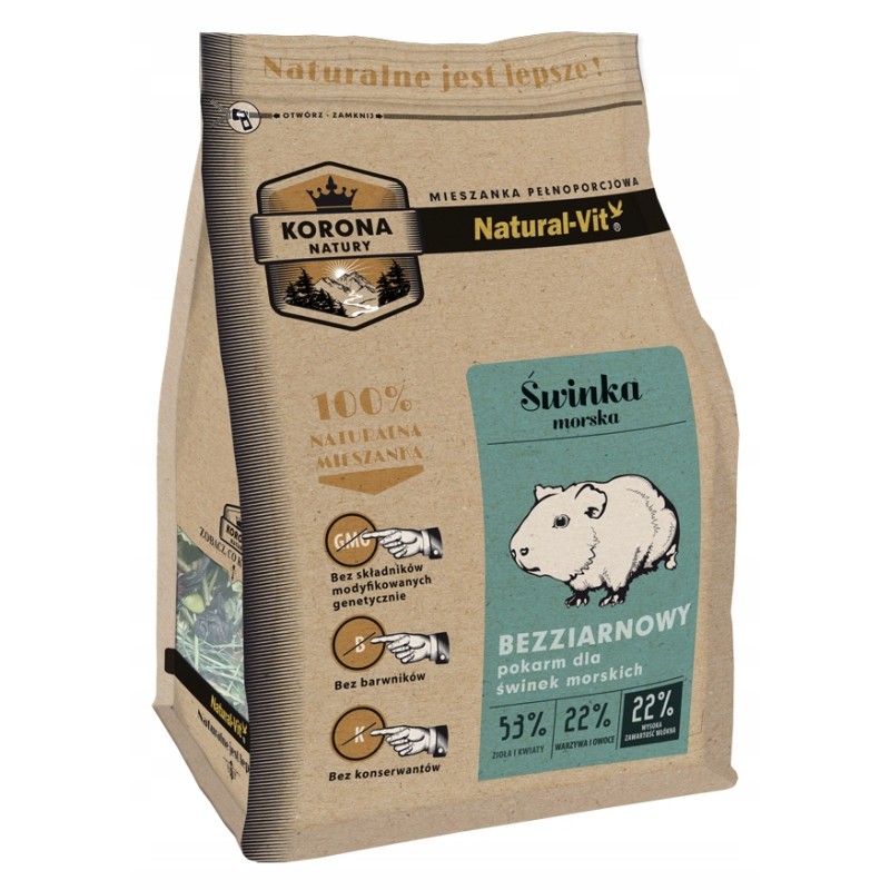 Karma "Mieszanka korona natury" dla świnki morskiej ma postać sypką, co pozwala zwierzęciu na naturalne wybieranie i gryzienie poszczególnych elementów. Należy pamiętać, że jest to pokarm podstawowy, który musi być uzupełniany nieograniczonym dostępem do świeżego, dobrej jakości siana, które jest absolutną podstawą diety każdej świnki morskiej oraz stałym dostępem do czystej wody. Świnki morskie wymagają również regularnego podawania świeżych warzyw bogatych w witaminę C, gdyż – podobnie jak ludzie – nie potrafią jej same syntetyzować.