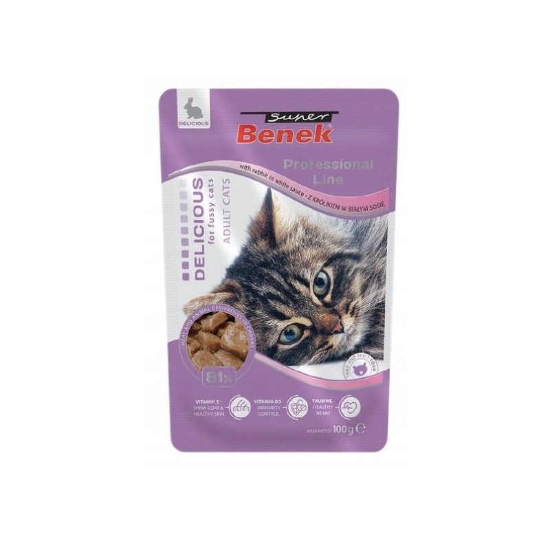 Saszetka Super Benek z królikiem to praktyczne i smaczne uzupełnienie codziennej diety. Polecana jest jako główny posiłek lub jako apetyczny dodatek do suchej karmy, który pomaga zwiększyć pobór wody. Pojedyncze opakowanie o wadze 100g (SKU: Z1001) idealnie nadaje się do bezpośredniego podania.