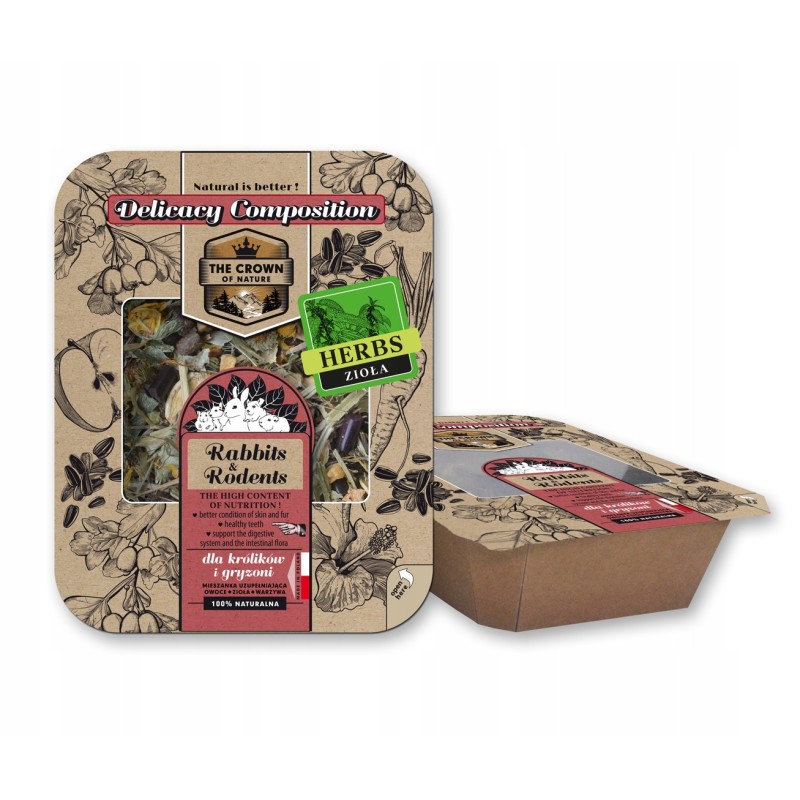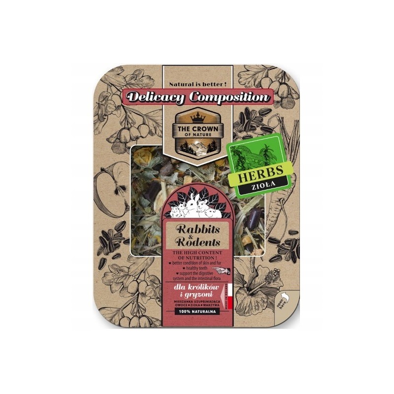 Mieszanka korona natury - delicja ziołowa marki CERTECH to starannie skomponowana, naturalna przekąska dla gryzoni, królików, szynszyli oraz innych roślinożernych zwierząt domowych. Jej podstawę stanowią wysokiej jakości, suszone zioła i kwiaty, które wzbogacają codzienną dietę o cenne składniki odżywcze i błonnik.