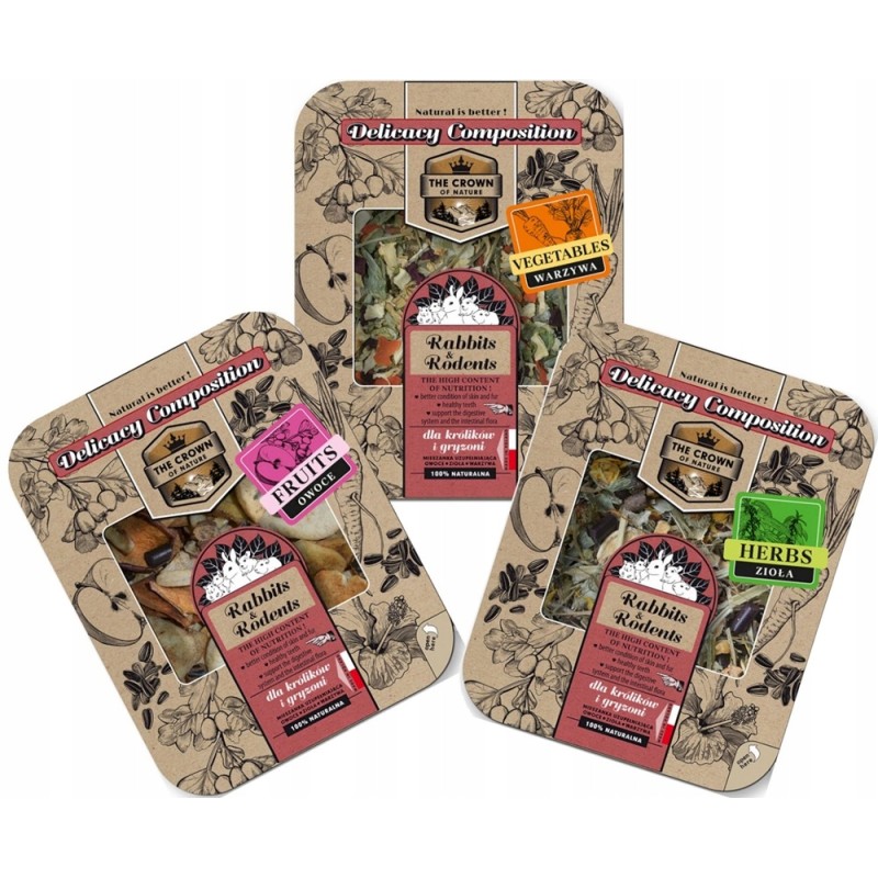 Skład produktu został opracowany tak, aby dostarczyć zwierzęciu różnorodnych smaków i aromatów, stymulując jego naturalne zachowania żerowe. W mieszance znaleźć można między innymi liście maliny, liście jeżyny, kwiaty nagietka, liście babki lancetowatej oraz pokrzywę. Są to składniki znane z pozytywnego wpływu na układ pokarmowy oraz ogólną kondycję zwierząt.