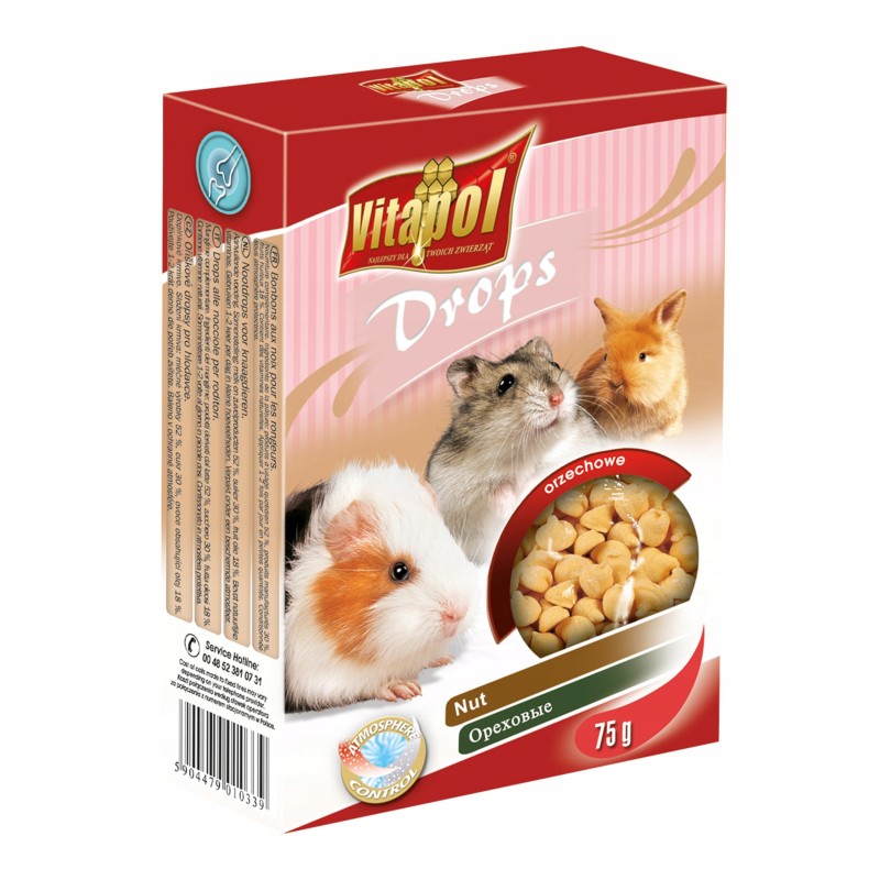 Drops dla gryzoni o smaku orzechowym to smaczny dodatek do codziennej diety Twojego podopiecznego. Te twarde, chrupiące kulki stanowią atrakcyjne urozmaicenie, które może pełnić również funkcję przekąski wspierającej naturalny instynkt gryzienia, pomagając w ścieraniu stale rosnących siekaczy.