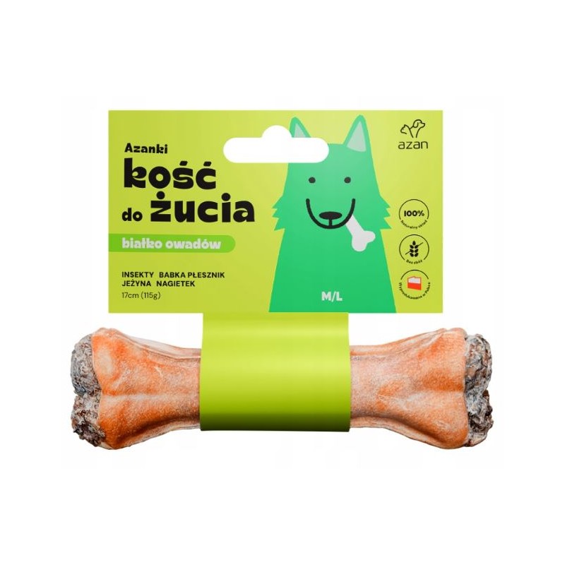 Ta kość z insektami i jeżyną marki AZANKI to wysokiej jakości, naturalna przekąska dla psów średnich i dużych ras. Produkt o wymiarach 17 cm został stworzony z myślą o zaspokojeniu instynktu żucia, wspieraniu zdrowia jamy ustnej oraz dostarczeniu wartości odżywczych w postaci białka owadów i owoców.