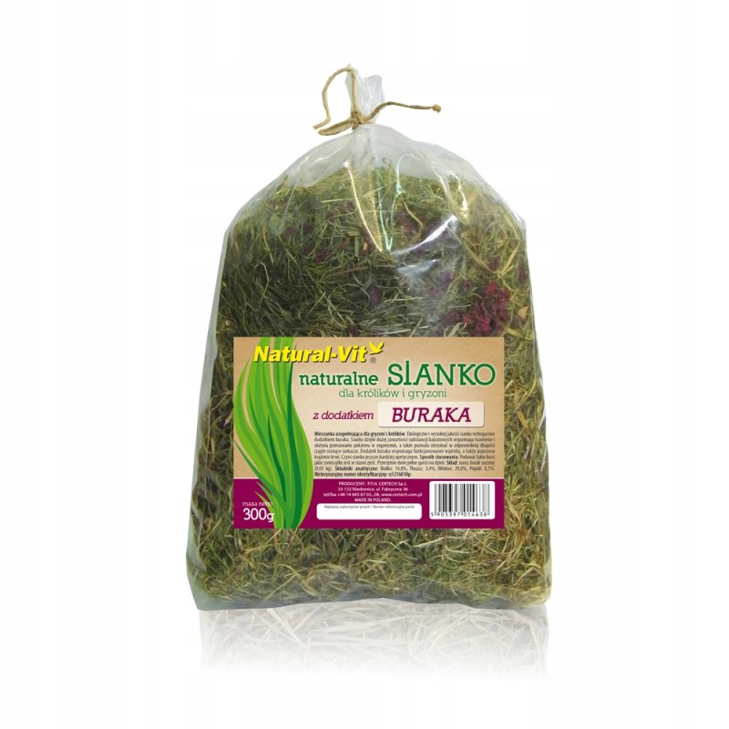 Opakowanie zawierające 300 gramów czystego, pachnącego sianka z burakiem jest wygodne w przechowywaniu i dozowaniu. Regularne podawanie tego produktu wspiera zdrowie układu pokarmowego, zapewnia zajęcie oraz naturalne ścieranie uzębienia, będąc jednocześnie smaczną przekąską. Stanowi idealne uzupełnienie codziennej diety w niezbędny błonnik.