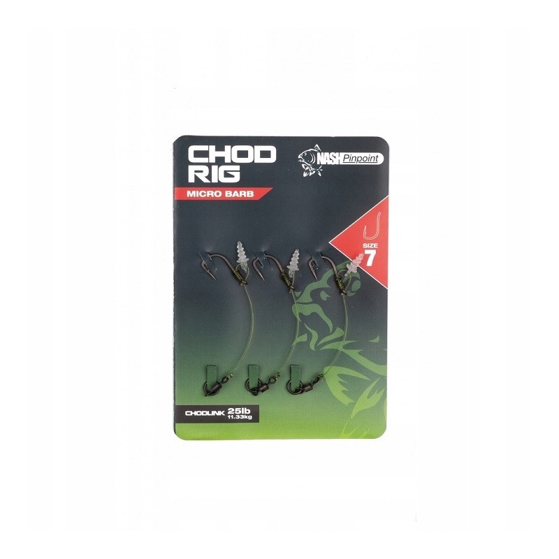 Precyzyjnie wyprofilowany chod rig zawiązany na haku Pinpoint Chod Twister. Przypon jest bardzo krótki, dzięki czemu przynęta unosi się blisko dna, nie wzbudzając w ten sposób podejrzeń karpi. Plastikowa wkrętka umożliwia błyskawiczną wymianę przynęty.