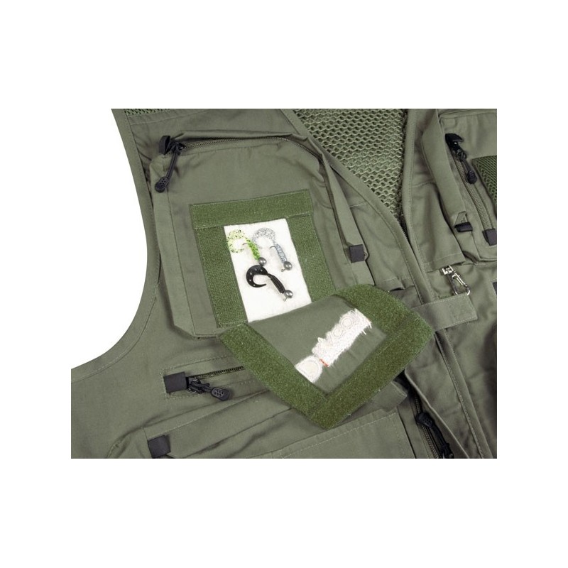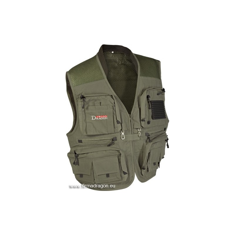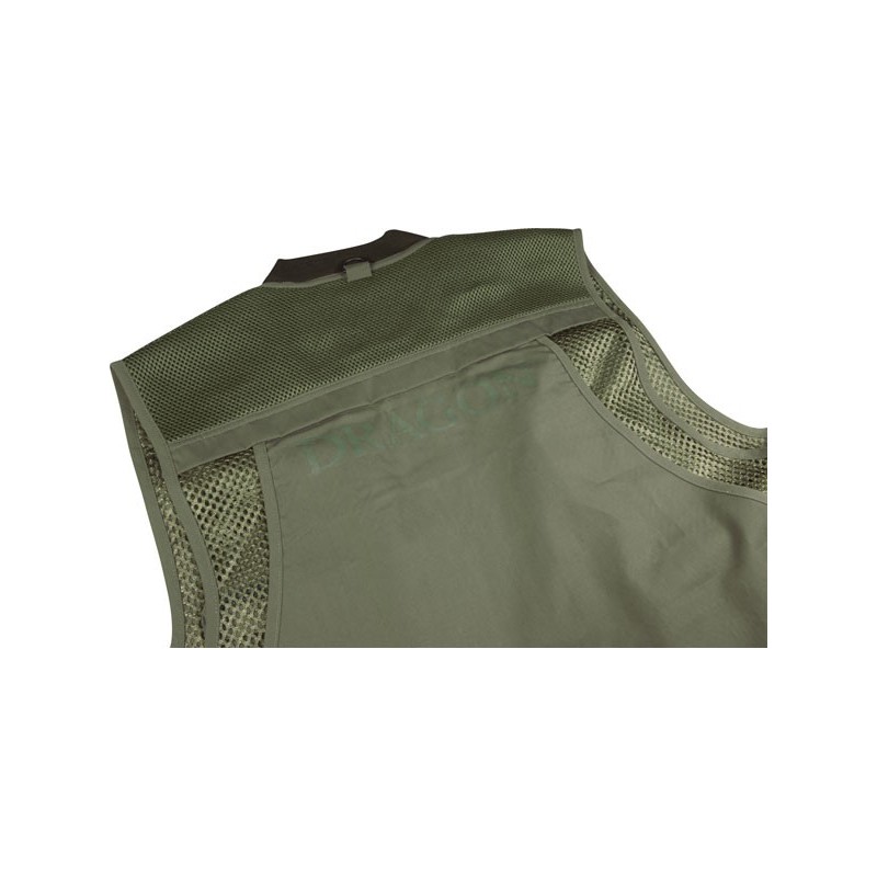 W kamizelkach Dragona zastosowaliśmy specjalny rodzaj tkaniny o nazwie Nylon Taslan Fabric™, która poza właściwościami odprowadzania wilgoci ma kilka nieocenionych zalet. Jest bardzo lekka, łatwa w czyszczeniu, a co najważniejsze – bardzo odporna na przetarcia. W dolnych, najczęściej używanych kieszeniach na pudełka zastosowaliśmy podwójne zamki dwukierunkowe. Funkcjonalnym dodatkiem są karabińczyki na sprężynowych linkach, które służą do zaczepienia peana, obcinaczek lub miarki.