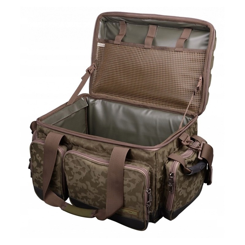 Niezwykle pojemna seria toreb typu carryall, którą każdy karpiarz powinien mieć w swoim ekwipunku! Torba wykonana z najwyższej jakości materiałów, dzięki czemu jest odporna na często trudne warunki jak kamieniste czy zalane błotem brzegi. Jej wnętrze wykończone jest łatwym w czyszczeniu, wodoodpornym PCV, zaś wieko zostało usztywnione, by wygodnie składować torby w namiocie lub korzystać z nich jako stolik. Pojemna komora główna a także 4 boczne kieszenie gwarantują sporą przestrzeń do transportu sprzętu. Torba wykończona w luksusowej kolorystyce Grade o delikatnym kamuflażu.
