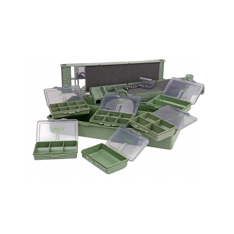 Kompletny Tackle Box z 2 deskami i 6 mniejszymi pudełkami na akcesoria.