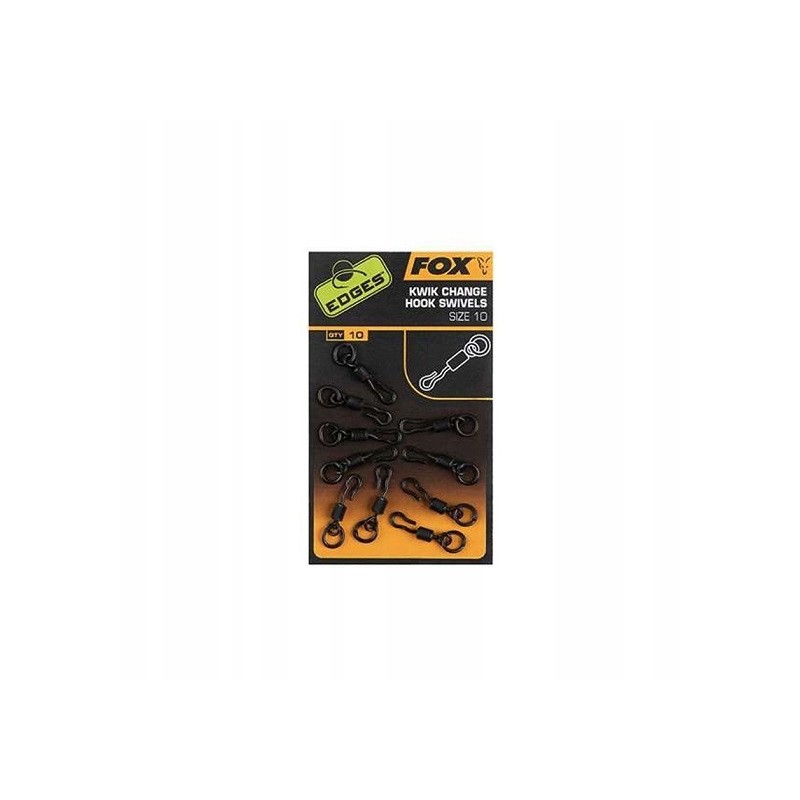 Fox Edges Kwik Change Hook Swivels to krętlik z kółeczkiem i klipsem szybkiej wymiany przyponu. Idealny do budowy zestawów takich jak Spinner Rig czy Ronnie Rig. Pokryty czarną, matową powłoką, która zapobiega powstawania refleksów świetlnych.