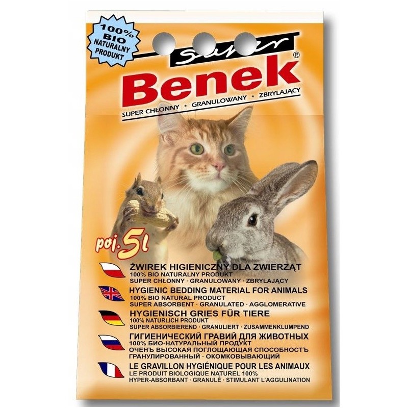 Super Benek uniwersalny naturalny to wysokiej jakości, ekologiczny żwirek bentonitowy dla kotów, oferowany w ekonomicznym, 5-litrowym opakowaniu. Jego głównym składnikiem jest naturalna, wysokojakościowa bentonit sodowa, znana ze swoich doskonałych właściwości wiążących wilgoć i nieprzyjemnych zapachów.