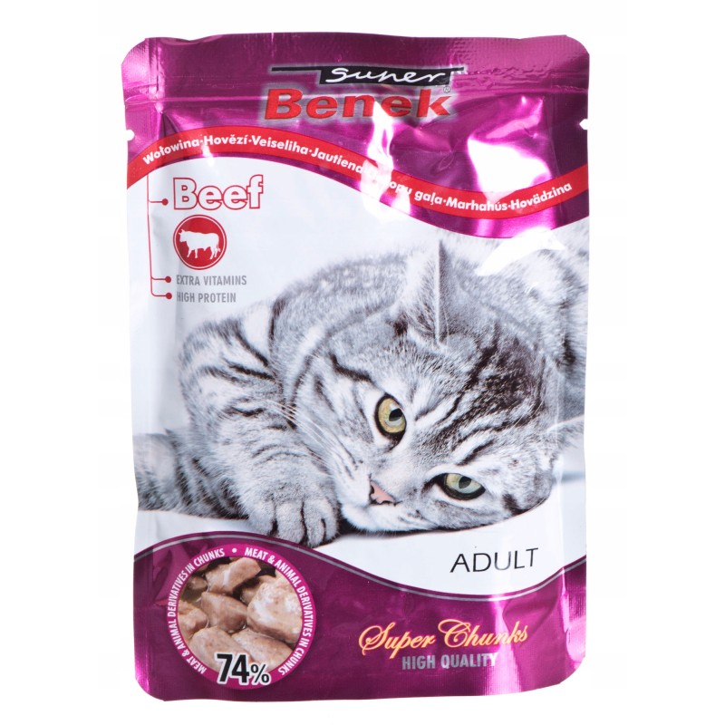 Super Benek to saszetka z kocim przysmakiem, która stanowi urozmaicenie codziennej diety Twojego kota. Produkt zawiera wołowinę w pysznym sosie, zapewniając posiłek o mięsnej konsystencji, który zaspokoi nawet wybredne podniebienia.