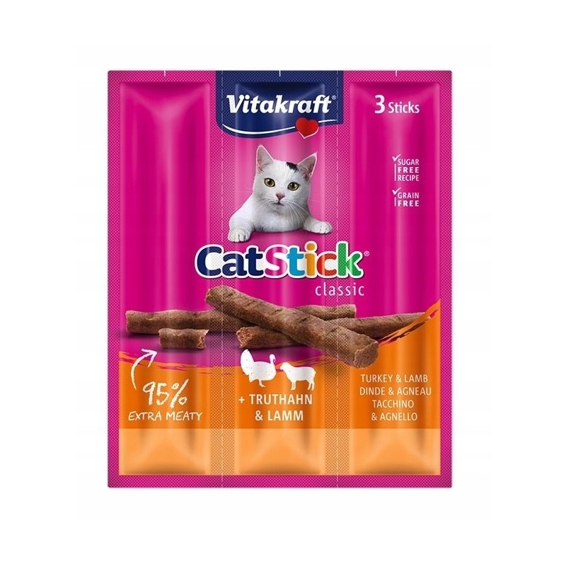 Paluszki Vitakraft Cat Stick o smaku indyka i jagnięciny są odpowiednie dla kotów dorosłych. Należy pamiętać, aby traktować je jako uzupełnienie zbilansowanej diety i nie przekraczać dziennej zalecanej porcji, podanej na opakowaniu przez producenta. Są one prostym i zdrowym sposobem na okazanie pupilowi troski i zadowolenie jego naturalnych instynktów łowieckich związanych z żuciem i gryzieniem.