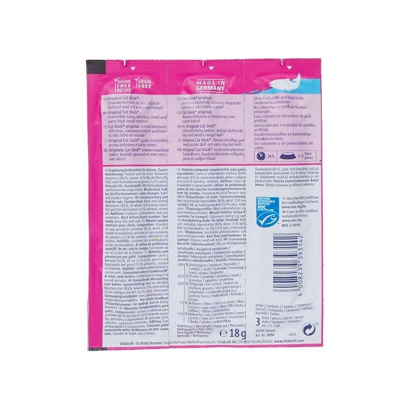 Produkt nie zawiera dodatku cukru ani sztucznych barwników i konserwantów, co czyni go odpowiednim wyborem dla opiekunów zwracających uwagę na jakość podawanych przekąsek. Cat Stick może służyć jako nagroda podczas zabawy, treningu lub po prostu jako codzienny przejaw troski. Pojedyncze, poręczne opakowanie zawierające trzy sztuki jest wygodne do przechowywania i kontrolowania dziennych porcji.