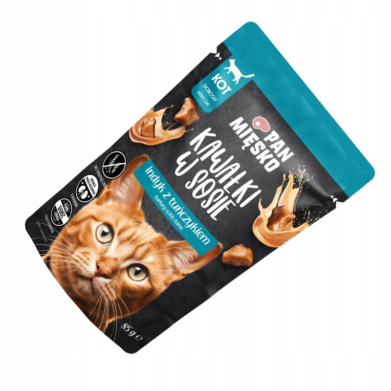 Ta mokra karma dla kota marki PAN MIĘSKO to kompletna i zbilansowana dieta w postaci apetycznych kawałków z indyka i tuńczyka w sosie. Formuła została opracowana, aby zaspokoić specyficzne potrzeby żywieniowe dorosłych kotów, dostarczając im wysokiej jakości białka zwierzęcego, które jest kluczowe dla utrzymania zdrowej masy mięśniowej.