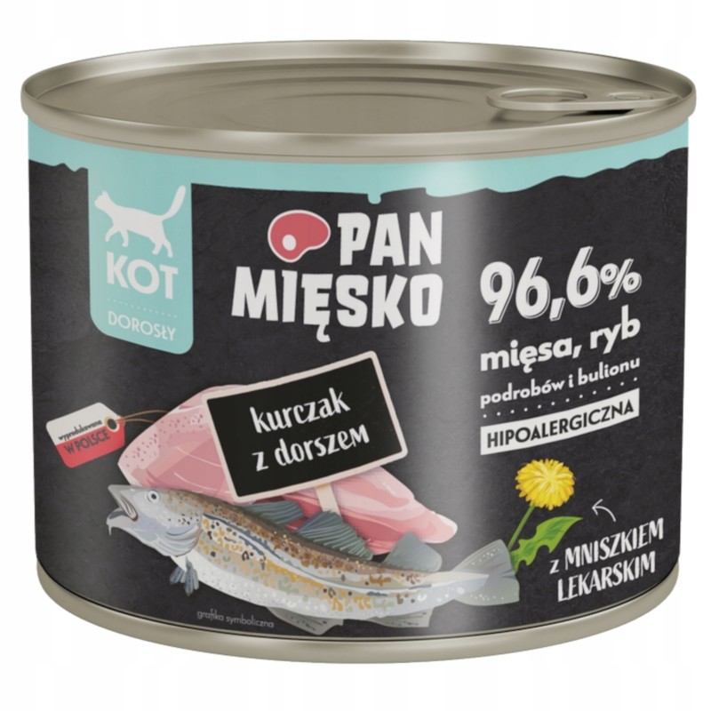 Karma PAN MIĘSKO w smaku kurczak z dorszem to propozycja dla opiekunów szukających smacznej, mokrej uzupełniającej diety lub głównego posiłku dla swojego kota. Zaleca się podawanie jako element zróżnicowanej diety, z zachowaniem dziennego zapotrzebowania kalorycznego pupila.