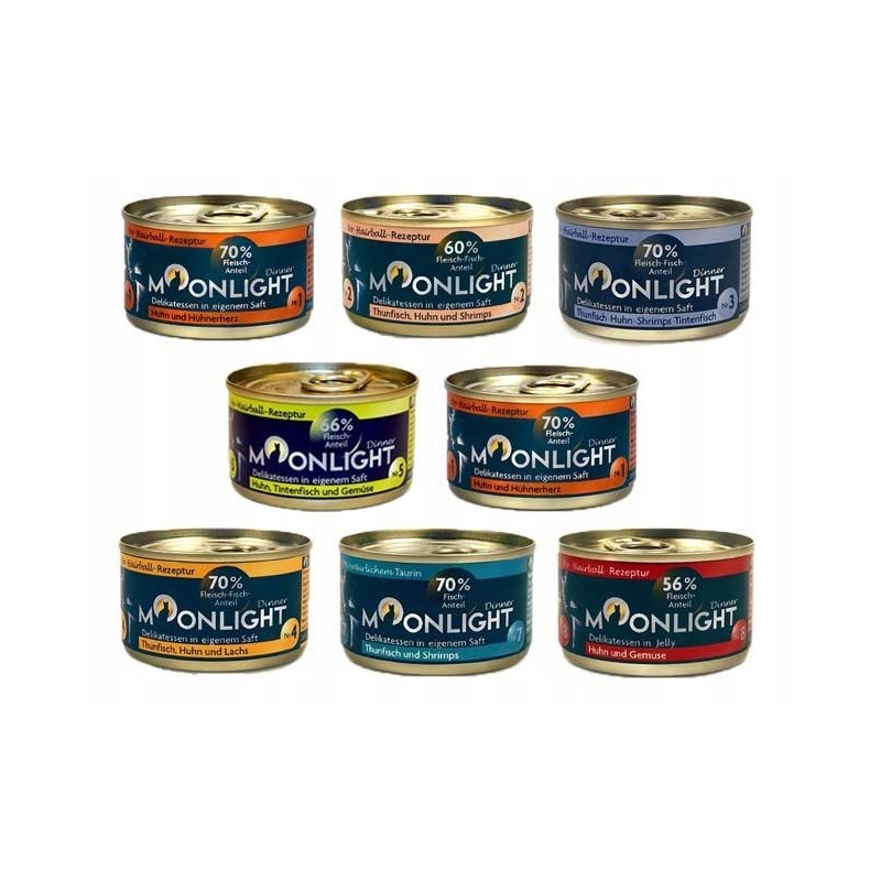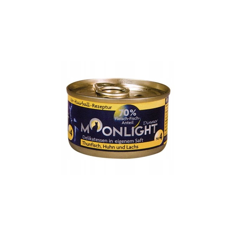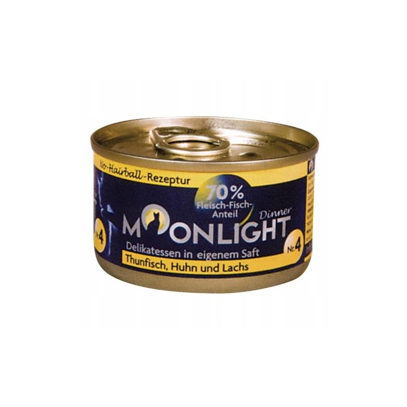 Moonlight 4 tuńczyk+kurczak+łosoś to kompletna, mokra karma dla kotów w formie pysznego pasztetu. Opakowanie zawiera cztery jednorazowe porcje po 80 gramów każda, co ułatwia precyzyjne dawkowanie i zachowanie świeżości.