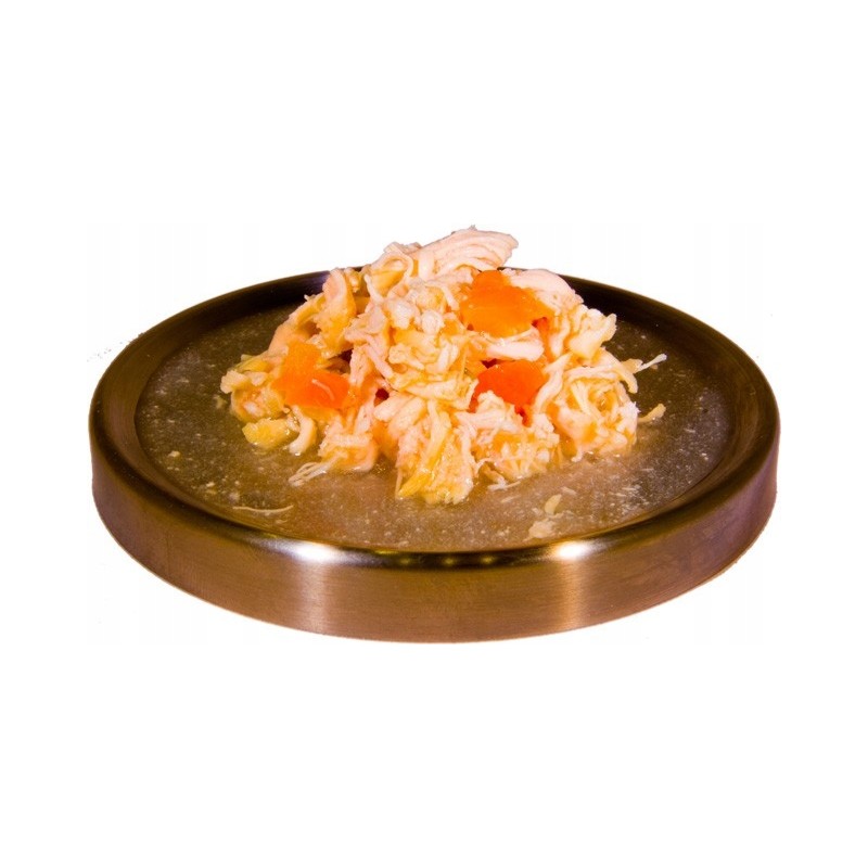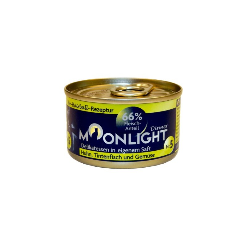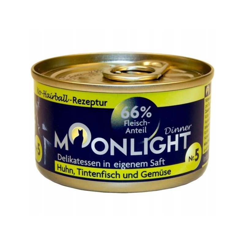Moonlight 5 kurczak+kałamarnica+warzywa to kompletna, zbilansowana karma mokra dla psów, dostarczająca wysokiej jakości białka zwierzęcego w połączeniu z dodatkiem warzyw. Porcja 80g stanowi wygodną, pojedynczą porcję, idealną jako samodzielny posiłek dla mniejszego psa lub smakowite uzupełnienie diety suchej dla psa większej rasy.