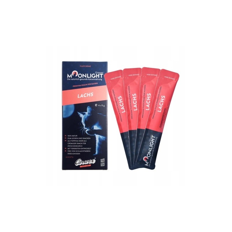 Moonlight creme łosoś to wysokiej jakości przysmak dla psów i kotów, dostępny w praktycznym opakowaniu zawierającym cztery porcje po 15 gramów każda. Ten mięsny krem stanowi atrakcyjne urozmaicenie codziennej diety, które może służyć jako nagroda treningowa, dodatek do posiłku lub smakowita zachęta do przyjmowania leków.