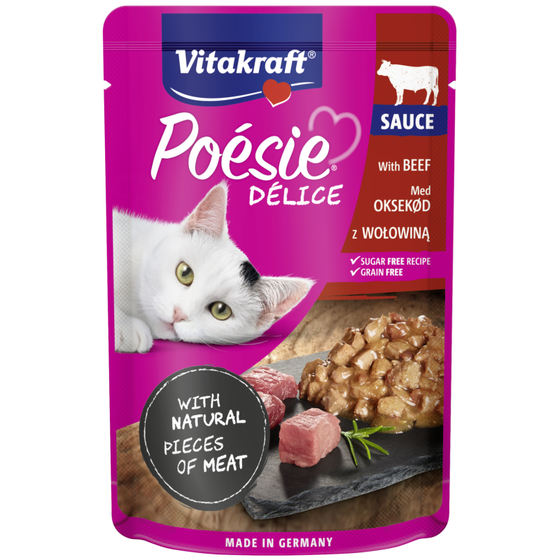 Karma Poesie Deli Sauce wołowina w sosie Vitakraft to sprawdzone rozwiązanie dla opiekunów, którzy chcą urozmaicić dietę swojego psa smacznym, mięsnym posiłkiem o gwarantowanej jakości. Idealnie sprawdzi się jako nagroda, dodatek lub główny posiłek w ciągu dnia.