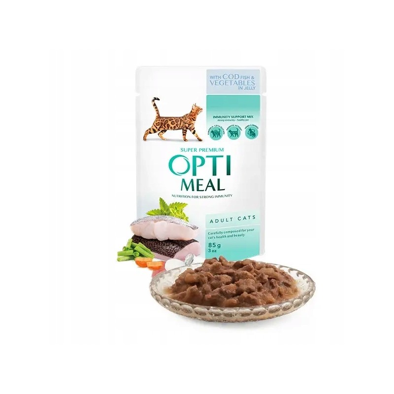 Karma OPTI MEAL Dorsz z warzywami to odpowiedni wybór dla opiekunów szukających urozmaicenia diety swojego kota smacznym, rybnym daniem o prostej, przejrzystej recepturze. Podawana samodzielnie lub jako dodatek do karmy suchej.