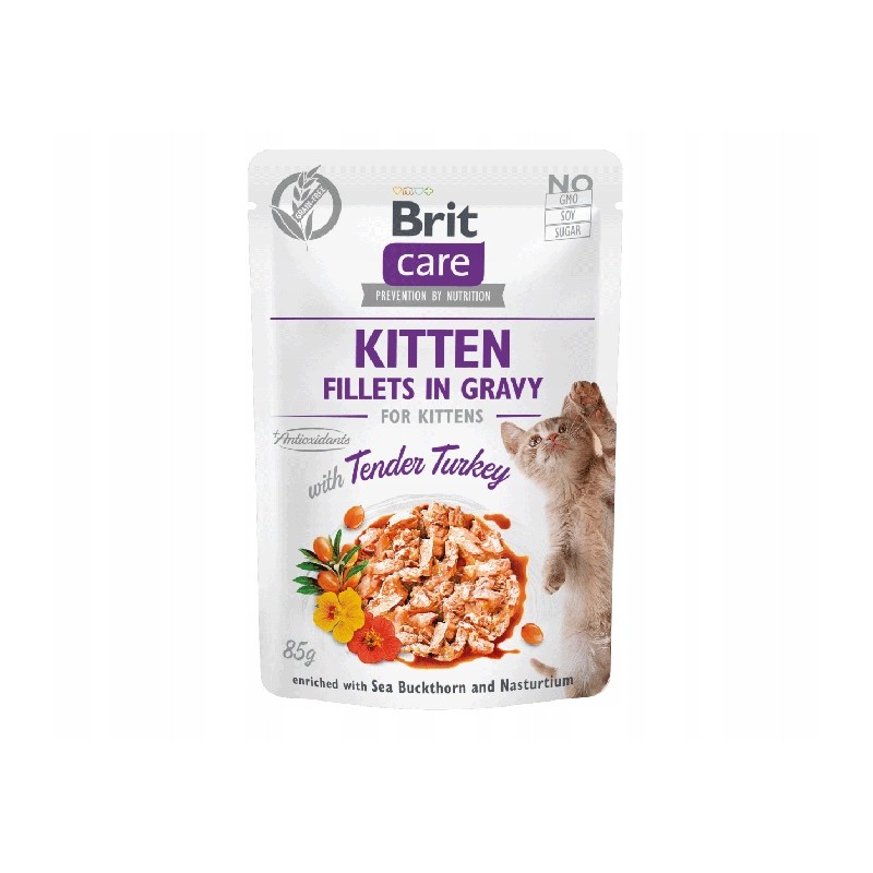 Produkt nie zawiera sztucznych barwników, konserwantów ani aromatów. Miękką, wilgotną konsystencję saszetki kocięta chętnie akceptują, co ułatwia podawanie. Karma BRIT CARE CAT Kitten z indykiem jest odpowiednia zarówno jako samodzielny posiłek, jak i urozmaicenie suchej diety. Saszetka o wadze 85g jest wygodna w użyciu i pozwala na precyzyjne porcjowanie.