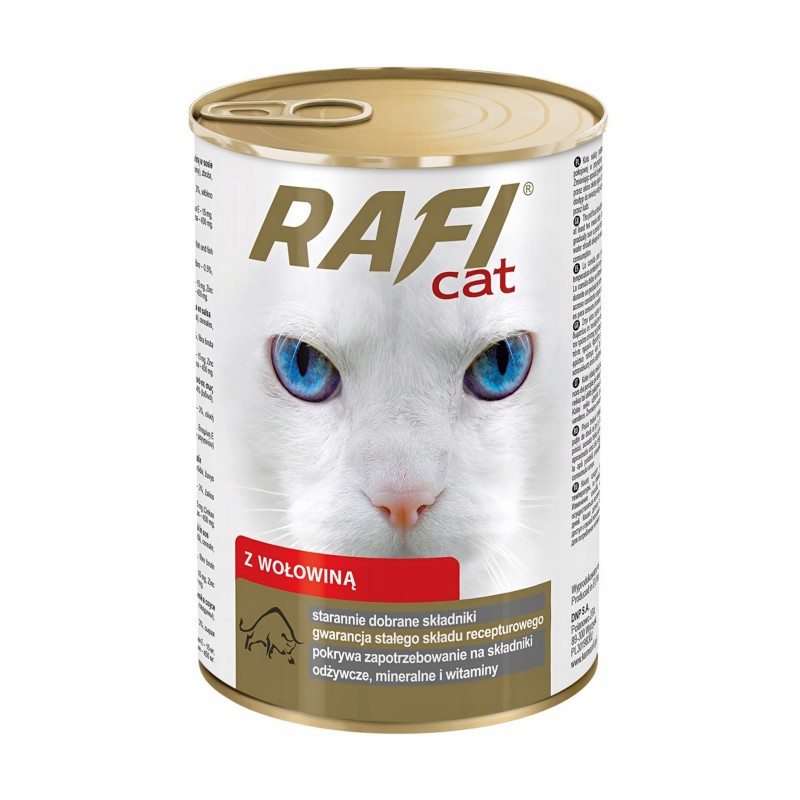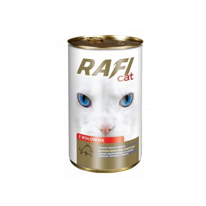 Ta mokra karma dla kota RAFI w postaci kawałków z wołowiną w sosie to kompletna i zbilansowana dieta, stworzona, by zaspokoić codzienne potrzeby żywieniowe dorosłych kotów. Producent, Dolina Noteci, oferuje pełnoporcjową recepturę, która dostarcza wszystkich niezbędnych składników odżywczych.