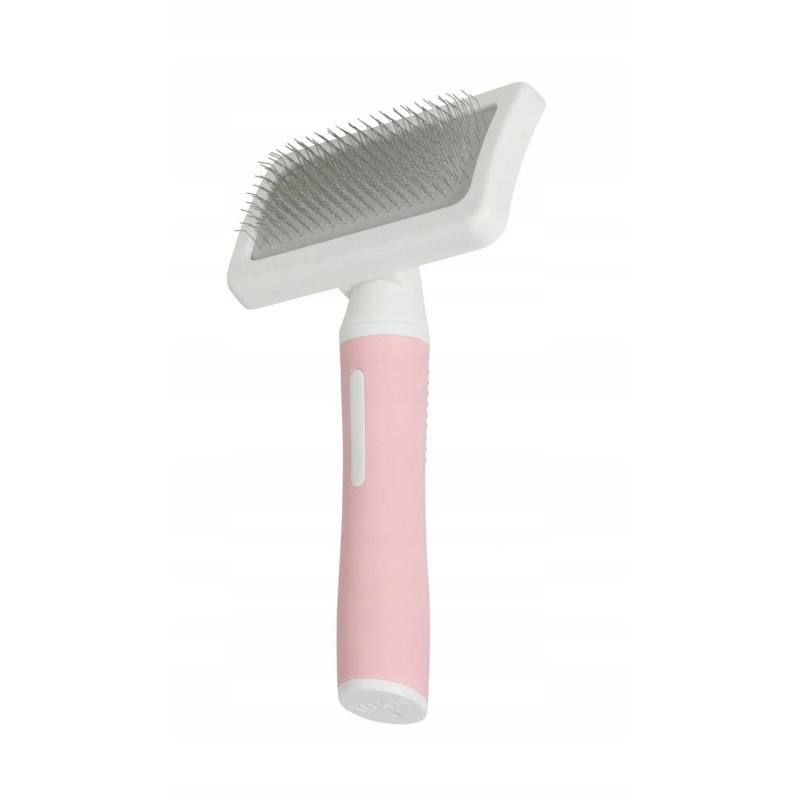 Jej konstrukcja jest prosta i ergonomiczna. Szczotka wyposażona jest w wygodny, plastikowy uchwyt, który pewnie leży w dłoni, co ułatwia przeprowadzanie nawet dłuższych sesji czesania. Kluczowym elementem jest główka z gęsto rozmieszczonymi, metalowymi pinami zakończonymi bezpiecznymi, zaokrąglonymi kuleczkami. Dzięki temu rozwiązaniu szczotka skutecznie rozczesuje włos, usuwając luźną sierść i delikatne podszycie, nie podrażniając przy tym skóry zwierzęcia. Jest to szczególnie ważne dla kotów krótkowłosych oraz tych o średniej długości włosa.