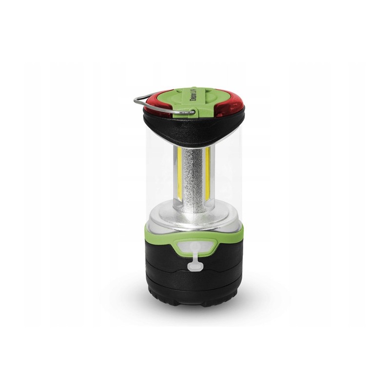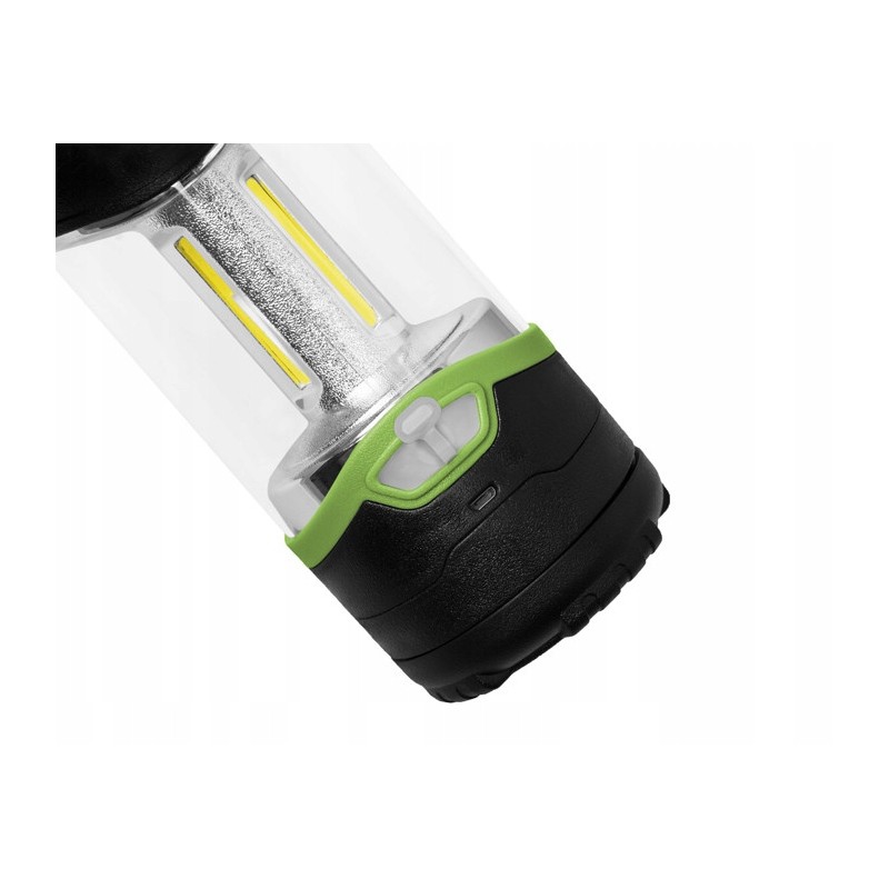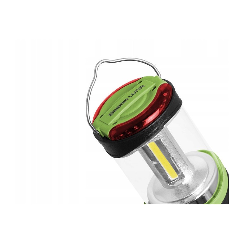 Lampa Delphin LUNA można wykorzystać podczas wędkarskich wypraw, wędrówek lub biwakowania. Waży zaledwie 261 gramów, a dzięki kompaktowym wymiarom nawet nie poczujesz jej w swoim bagażu. Oferuje 4 tryby świecenia: 100% świecenia po pierwszym naciśnięciu, 50% po drugim naciśnięciu, czerwone światło po trzecim naciśnięciu i migające czerwone światło po czwartym naciśnięciu. 3 panele LED z białym światłem i czerwonymi diodami LED są zasilane przez wyjmowaną baterię 18650. Lampa może dostarczać 5 W przy 220 lumenach. Akumulator można naładować za pomocą dołączonego kabla USB. Lampa kempingowa może być umieszczona na twardej powierzchni lub zawieszona na metalowym pręcie umieszczonym na górze. Złącze ładowania jest chronione gumową zatyczką.