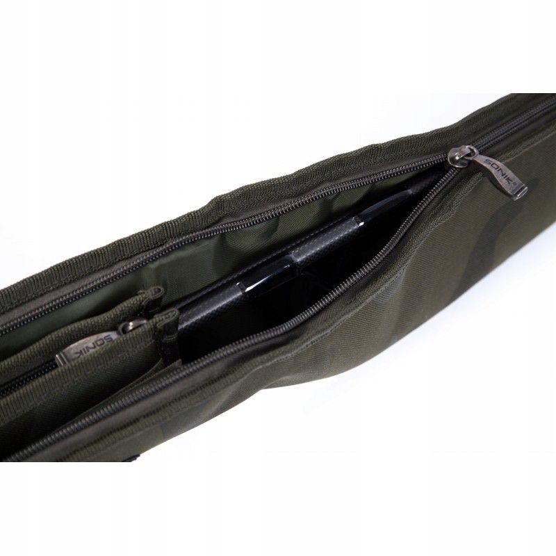 W pełni wyściełany pokrowiec na wędkę, który może być szybko i łatwo dostosowany do długości przenoszonego wędziska. Dodatkowe zewnętrzne mocowanie na podbierak, mocowania na podpórki i mała kieszonka na akcesoria/ciężarki pozwalają zredukować ilość zabieranego bagażu podczas szybkich zasiadek.