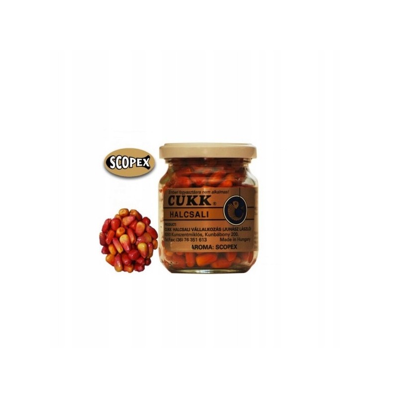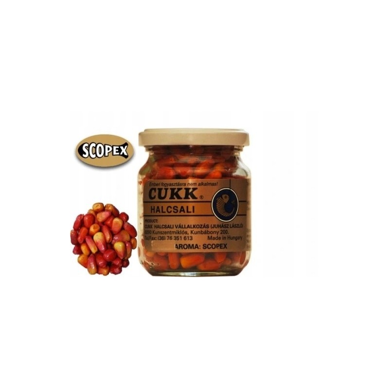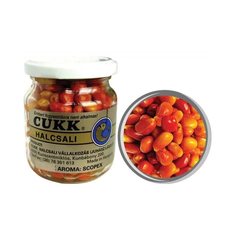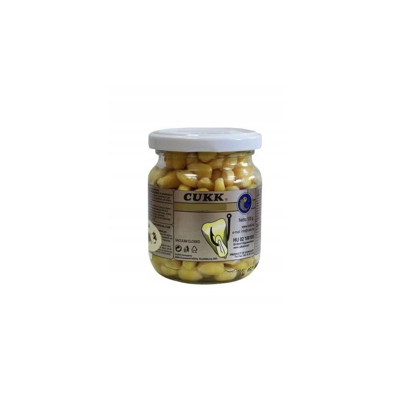 Różne rodzaje kukurydzy wędkarskiej w słoiczku CUKK, idealne pełne ziarna kukurydzy. Twardość ziaren i ich wytrzymałość na haczyku są idealne. Po otwarciu tego produktu można go używać przez wiele miesięcy bez ryzyka zepsucia. Barwniki stosowane do różnych rodzajów kolorowej kukurydzy wędkarskiej bez zalewy są kwalifikowane jako artykuły spożywcze i nie stanowią niebezpieczeństwa dla zdrowia i środowiska.