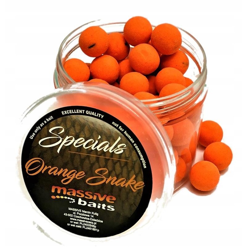 Special Pop-Ups Orange Snake to intensywny aromat przyprawionych owoców, których główną nutą jest olejek eteryczny mandarynki. To pływające przynęty, które zostały ręcznie wykonane z najwyższej jakości mieszanki, posiadają bogatą dawkę płynnych i sproszkowanych aromatów. Ich cechą charakterystyczną jest duża, stabilna wyporność, która potrafi utrzymać podwieszona kulkę tonącą czy ciężki zestaw Chod przez wiele godzin w odpowiedniej pozycji. Chropowata faktura kulki znacznie ułatwia wchłanianie dipów oraz stopniowe uwalnianie ich w łowisku. Intensywny kolor kulki umożliwia jej szybką lokalizację przez karpia. Special Pop-Ups są świetnym uzupełnieniem serii, sprawdzą się wszędzie tam, gdzie odpowiednia prezentacja przynęty tonącej jest utrudniona.