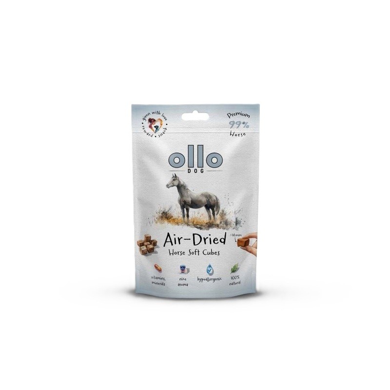 Ollo air dried Horse cubes #14mm 80g to monobiałkowa, liofilizowana przekąska dla psów, stworzona z jednego, wysokiej jakości źródła białka. Głównym i jedynym składnikiem mięsnym tego produktu jest suszone na zimno mięso końskie, co czyni go doskonałym wyborem dla czworonogów z wrażliwym układem pokarmowym lub nietolerancjami pokarmowymi.