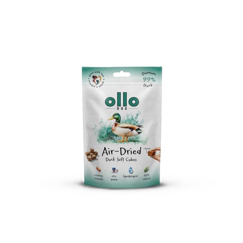 Ollo air dried Duck cubes #14mm 80g to naturalny, jednogatunkowy przysmak dla psów, stworzony z jednego, wysokiej jakości źródła białka. Produkt ten stanowi doskonałe uzupełnienie diety lub atrakcyjną nagrodę podczas szkolenia, szczególnie dla zwierząt z wrażliwym układem pokarmowym lub nietolerancjami pokarmowymi.