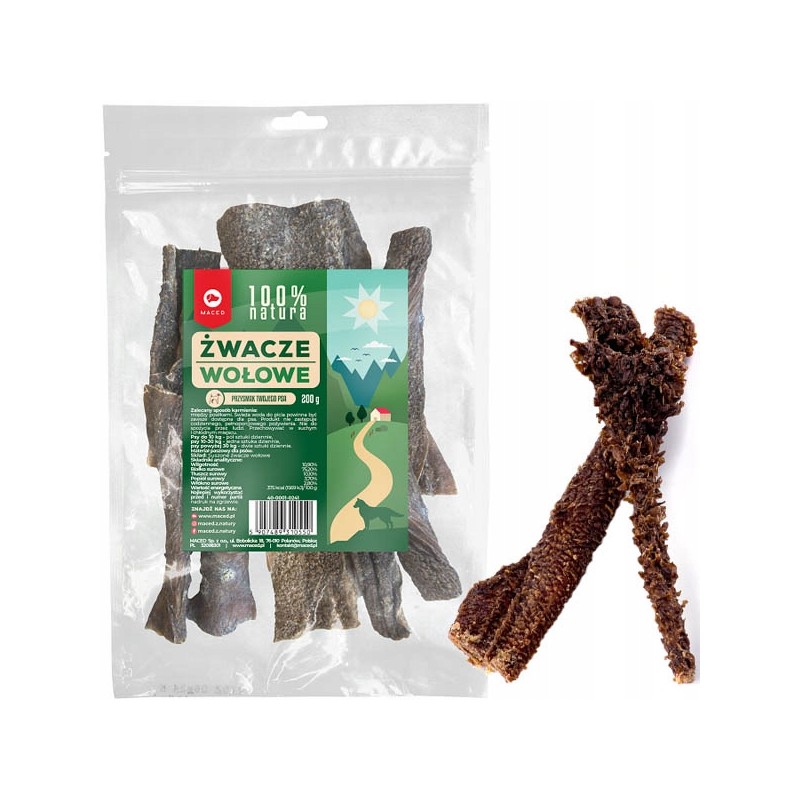 Żwacze wołowe marki MACED to naturalny, pojedynczy składnik w formie suszonej przekąski, przeznaczony głównie dla psów. Produkt powstaje z suszonego, zielonego żwacza wołowego, który jest pierwszą komorą żołądka przeżuwaczy. Proces suszenia pozwala zachować wartości odżywcze, jednocześnie zapewniając trwałość i wygodę przechowywania.