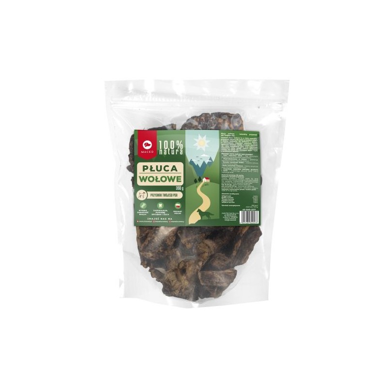 Płuca wołowe 350g od MACED to naturalny, jednoskładnikowy przysmak dla psów i kotów, stanowiący wartościowe uzupełnienie ich diety. Produkt ten to suszone płuca, pochodzące wyłącznie od bydła, bez dodatku zbóż, konserwantów, barwników czy wzmacniaczy smaku.