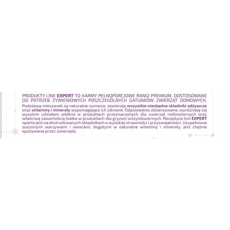 Karmę Expert Kawia Domowa należy podawać jako podstawowy element diety, który jednak musi być uzupełniony o nieograniczony dostęp do świeżego, dobrej jakości siana oraz czystej wody. Siano jest absolutną podstawą diety świnki morskiej i nie może zostać zastąpione przez suchą karmę. Zaleca się również regularne wzbogacanie jadłospisu o świeże, bezpieczne warzywa i zioła. Opakowanie 750g jest poręczne i zapewnia zapas pożywienia na odpowiedni czas, przy zachowaniu świeżości produktu.