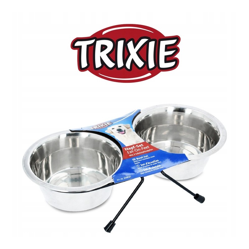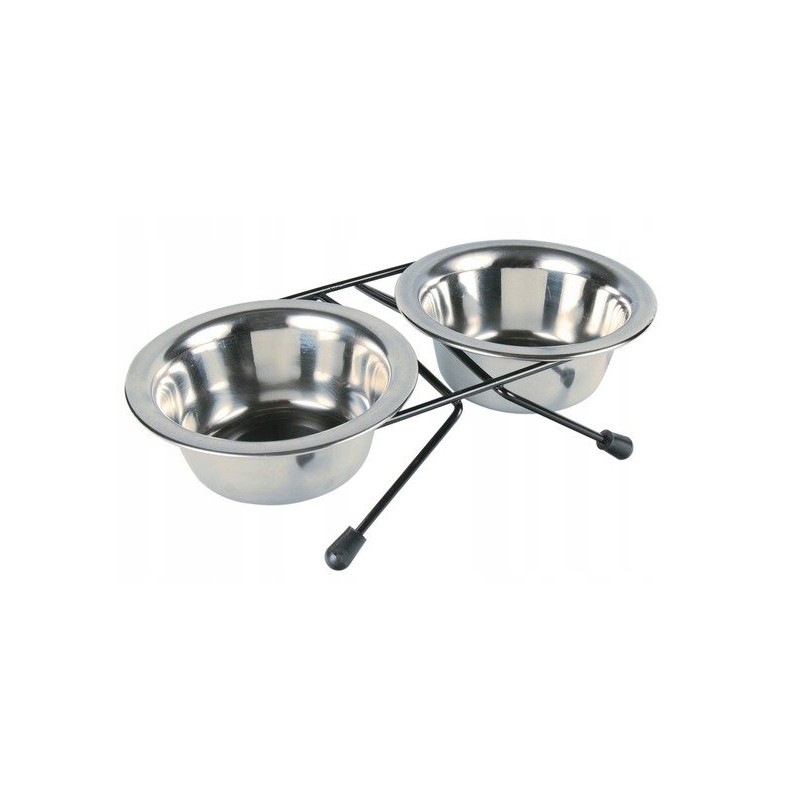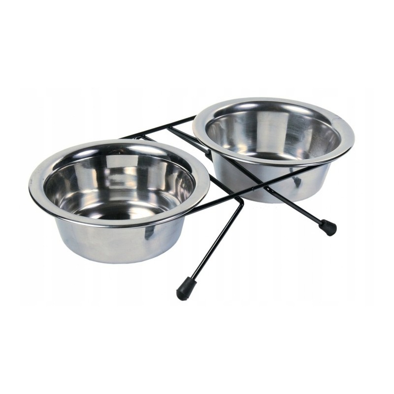 Zestaw zawiera dwie stalowe miski o pojemności 0,45 litra każda, które idealnie wsuwają się w uchwyty stojaka. Można je w łatwy sposób wyjąć do mycia lub napełniania. Taka separacja pozwala na podawanie świeżej wody i karmy w oddzielnych, zawsze gotowych naczyniach.