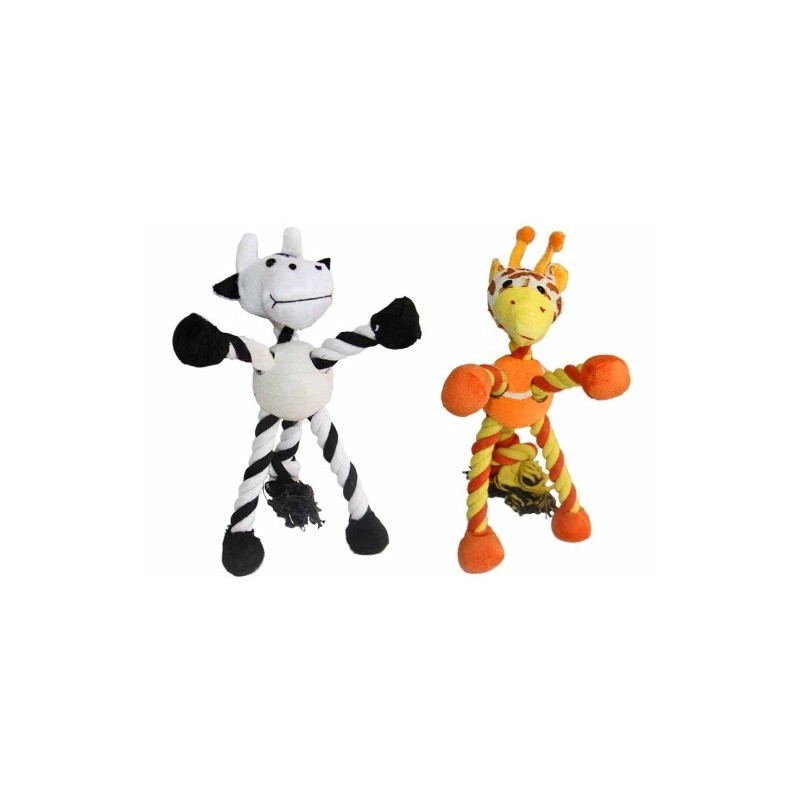 Zabawki wykonane są z wytrzymałych, bezpiecznych materiałów, odpornych na uszkodzenia mechaniczne. Ich intensywny, kontrastowy wzór w żółto-brązowe (żyrafa) oraz czarno-białe (krowa) łaty stymuluje wzrok psa, zachęcając do zabawy. Miękka, pluszowa struktura sprawia, że zabawki są przyjemne w chwytaniu i aportowaniu, a wewnętrzny piszczek dodatkowo wzbudza zainteresowanie czworonoga, angażując jego słuch i instynkty łowieckie.