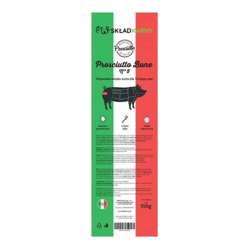 Przechowuj w suchym i chłodnym miejscu. Kość prosciutto biodrowa to wartościowy, długo się cieszący przysmak, który łączy przyjemność gryzienia z korzyściami zdrowotnymi.