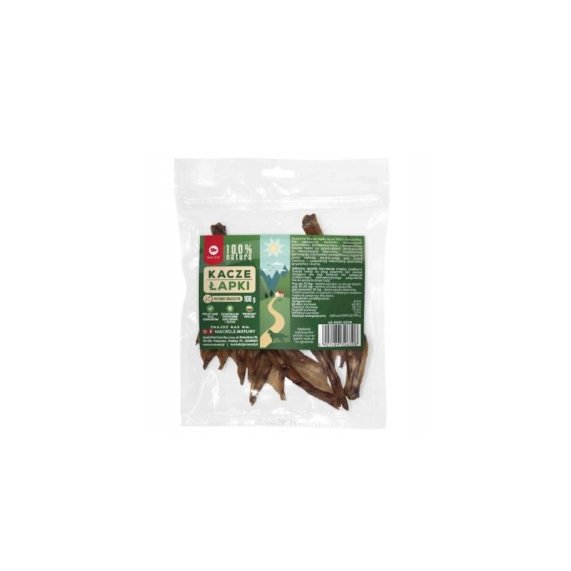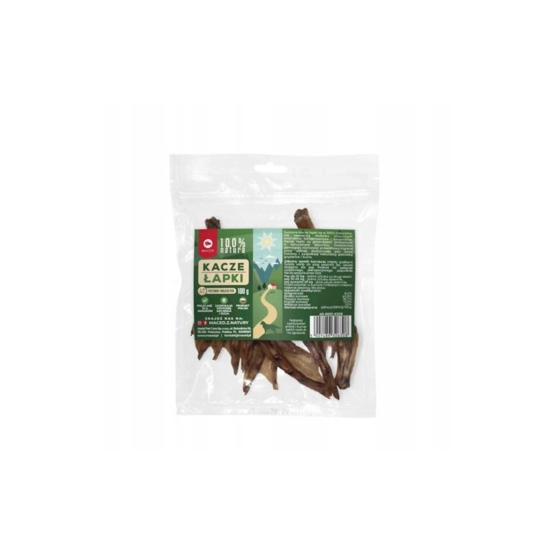 Kacze łapki to naturalny przysmak, który wzbudza entuzjazm u wielu psów. Produkt firmy MACED, zapakowany w poręczne opakowanie 100g, stanowi prosty i wartościowy dodatek do codziennej diety lub atrakcyjną nagrodę treningową.